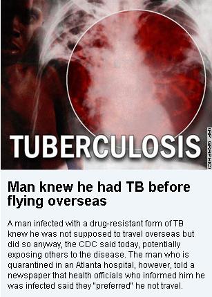 Now, this thing just screams, “run for the hills! Lock yourself in a fallout shelter! Tuberculosis is a’coming, and he is gonna kill your baby!”. Now, I am all for public health and awareness, but this much press to this case of TB is a little bit blown out of proportion. I say this, because even though it is a drug resistant strain of TB, this is what the CDC has to say about TB in the US: